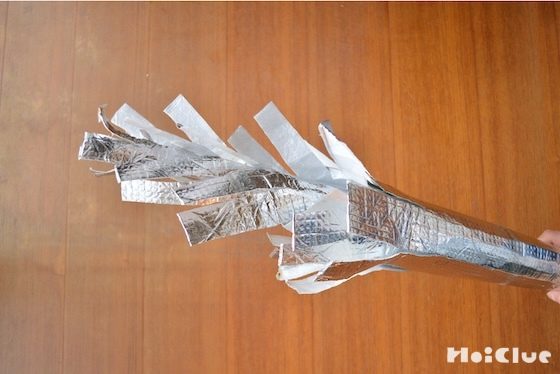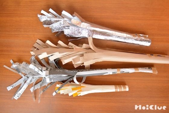 新聞紙で作ったあとは、他の素材で伸びる棒を作ってみると、いろいろなものに見えて、ごっこ遊びが楽しくなりそう!