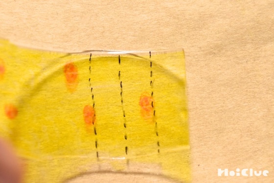 4、インクが乾いたら、横7mm、縦1.5cmぐらいの大きさに切り分ける。長さや幅はおおよそでOK。(写真のように点線で印をつけると切りやすい)