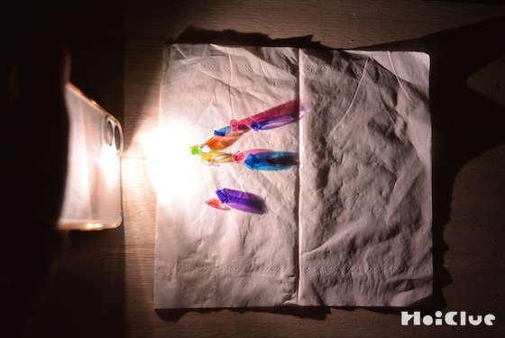 ライトを当てると、ビーズの色と影が浮かび上がり、不思議な影あそびに。