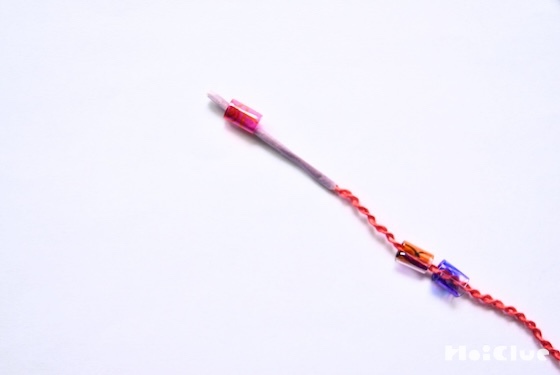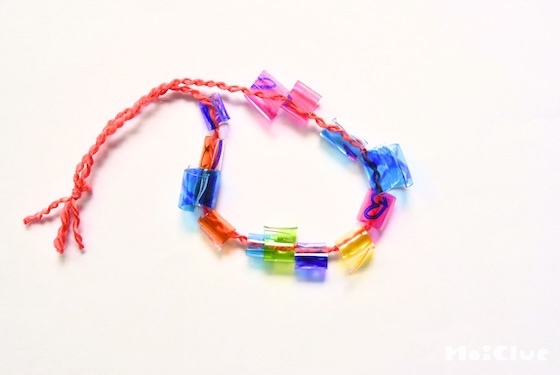 糸に通せば、ブレスレットやキーホルダーに変身!(糸の先にセロハンテープやマスキングテープを巻くと、ビーズが通りやすくなります。)