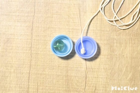 2、ペットボトルキャップの一つにはビー玉を、もう一つには玉結びした方のたこ糸を入れる。