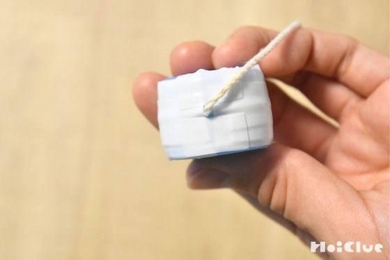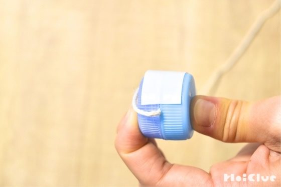 キャップにたこ糸を巻きつけ、輪っか部分に指を入れたら準備完了!