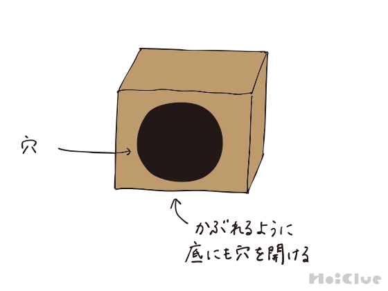 頭がすっぽりおさまるような四角いダンボールに、穴を開けたもの。