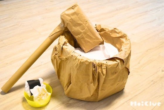 臼と杵でお餅つき〜ダンボールとバケツを使った手作りごっこ遊び〜