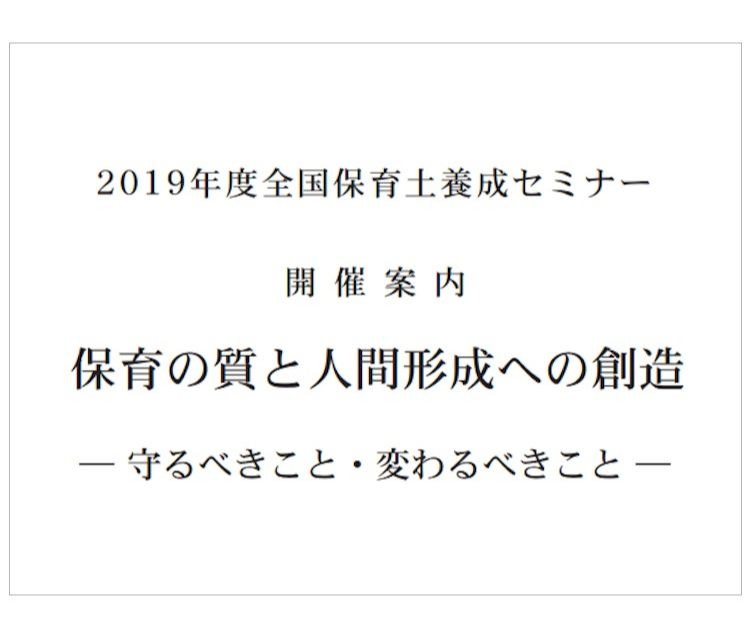 2019 年度の本セミナー(近畿ブロック・神戸大会)は、これまで脈々と継続、発展されながら保育の新時代を迎えたことを受けて、新しい時代にふさわしい保育の課題について模索し、会員の皆様と共に知恵を出し合いながら、これからの保育者の養成について志向していきたいと考えています。