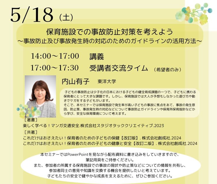 本セミナーではPowerPointを見ながら配布資料に書き込みをしていきますので、筆記用具をご持参ください。また、参加者の所属する保育施設での事故の現状や防止策などについての情報を共有し、参加者同士の意見や知識を交換する機会を提供したいと考えています。