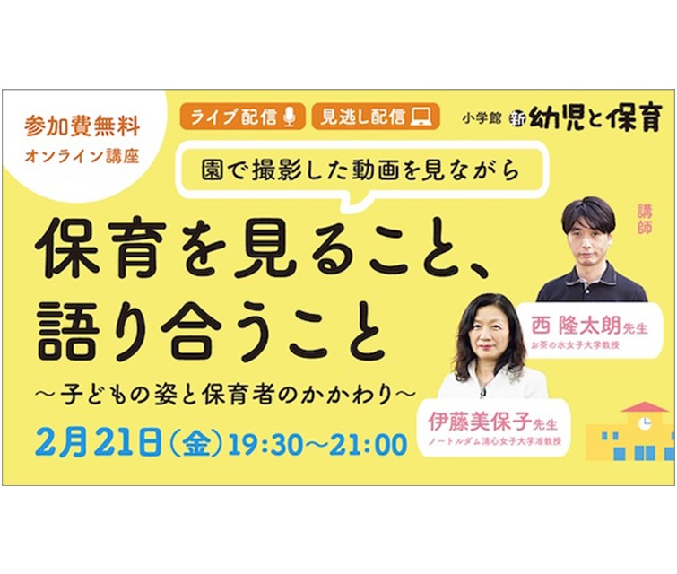 『0~5歳児保育の写真・動画から学ぶ 保育を見ること、語り合うこと』の発売を記念して、著者の西 隆太朗先生(お茶の水女子大学教授)、伊藤美保子先生(ノートルダム清心女子大学准教授)を講師に招いて無料オンライン講座を開催します。