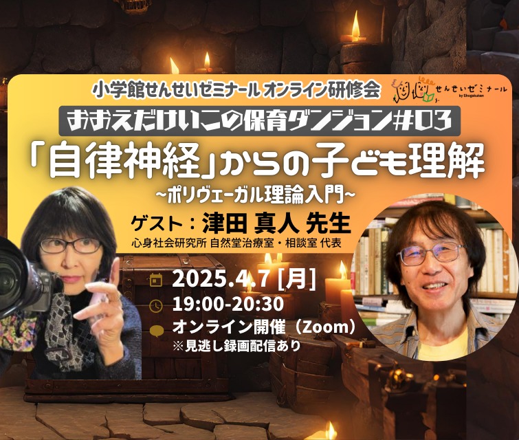 今回のダンジョンでは、このポリヴェーガル理論の第一人者である津田真人先生をゲストに、理論の基礎から実践的な活用方法までお話を伺っていきます。学びを通じて、子どもの行動の意味をより深く理解できるようになるとともに、保育者自身のメンタルヘルスケアに活かすことで、より持続可能な保育実践につながることが期待できます。