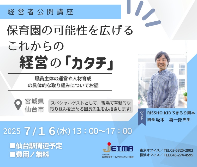 本セミナーでは、職員の成長が保育園全体の可能性を広げる鍵であることに焦点を当て、職員主体の運営や人材育成の具体的な取り組みについてお話しします。