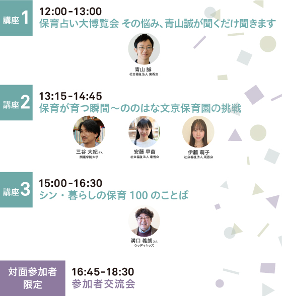 保育を多様な視点から問い、考え、対話する3つの講座を、対面参加もしくはオンライン(見逃し配信あり)でご視聴いただけます。