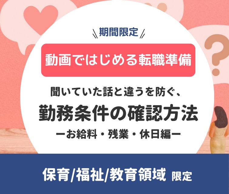 【動画ではじめる転職準備】保育/福祉/教育領域 限定|聞いていた話と違うを防ぐ、勤務条件の確認方法ーお給料・残業・休日編ー