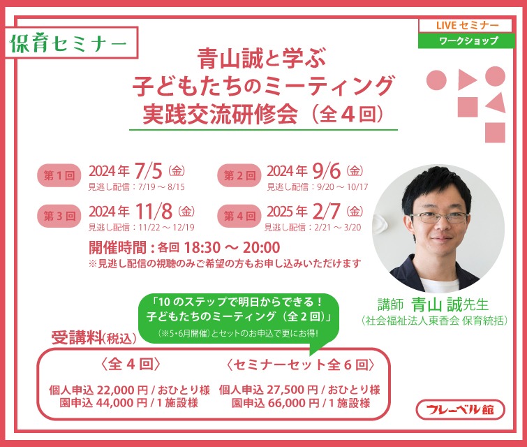 - 【全4回分】 <個人申込>22,000円(税込)/おひとり様 <園申込>44,000円(税込)/1施設様※全4回分の料金です。※「10のステップで明日からできる!子どもたちのミーティング 全2回」とセットの全6回のまとめて申し込みもございます。