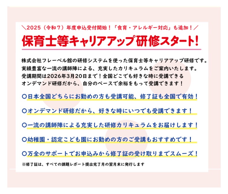 - 株式会社フレーベル館の研修システムを使った「保育士等キャリアアップ研修」のご案内です。