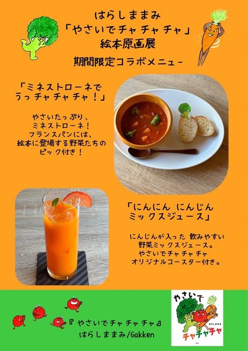 はらしままみさんの絵本『やさいでチャチャチャ』(Gakken)の原画展示、絵本・オリジナルグッズ販売、コラボメニューをご提供します。
