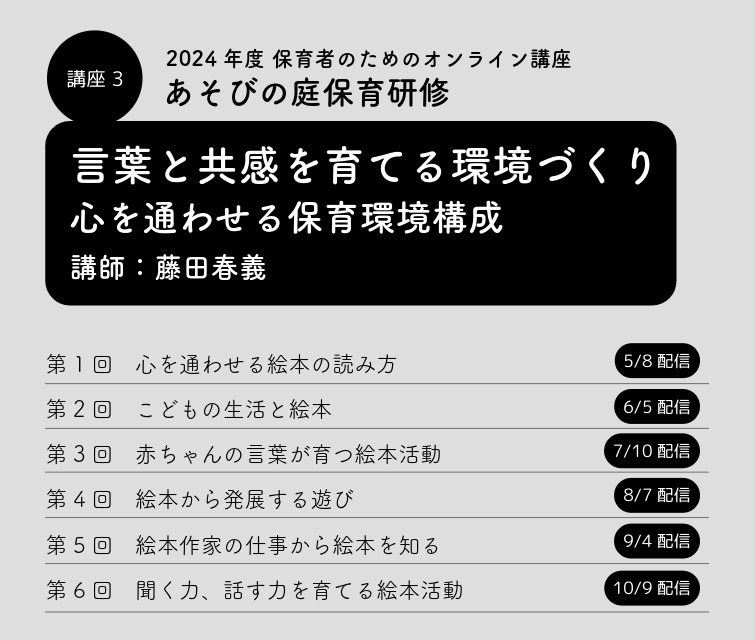 本講座は、絵本という環境構成を理解し、活用できるよう基礎から実践までを体系的に網羅した講座になります。新人からベテランまで広く学ぶことができる内容です。