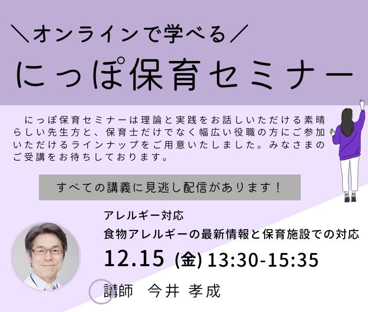 本セミナーでは乳幼児期の食物アレルギーの最新情報と正しい知識をお伝えし、それらを踏まえた保育施設職員としての対応と保育施設での組織としての対応について学んでいただきます。