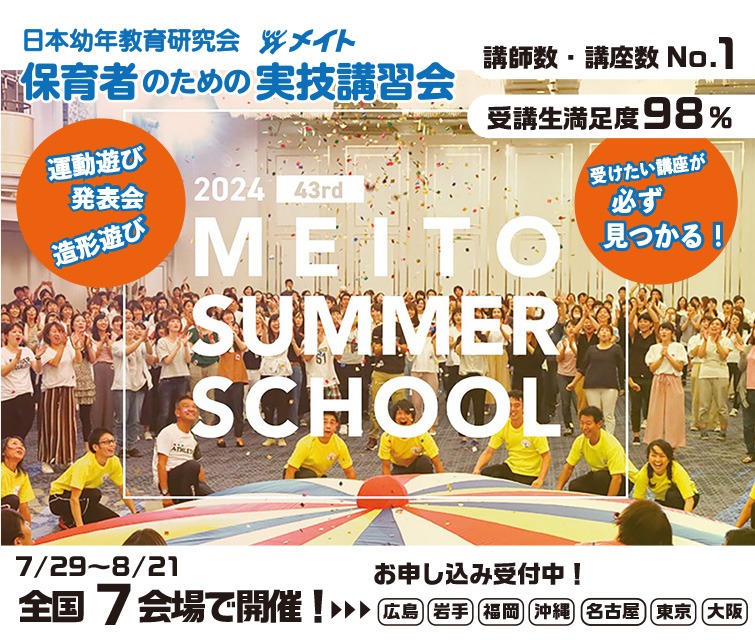 メイトのサマースクールは、今年で43回目を迎える保育実技研修会です。2024年は、「中国大会」(広島開催)をはじめ、全国7会場(盛岡・東京・名古屋・大阪・広島・福岡・沖縄)で開催します。