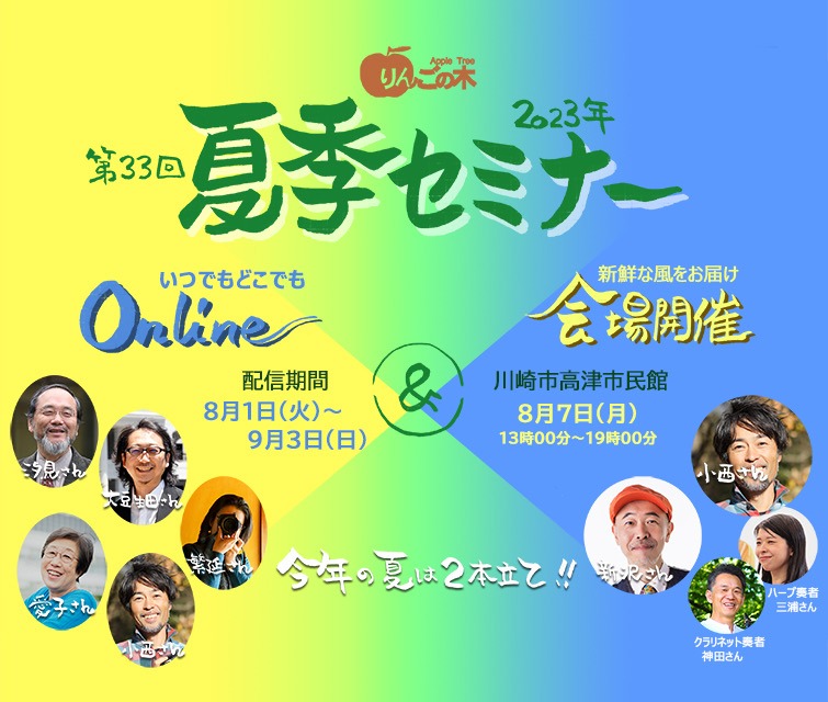 今年のりんごの木の夏季セミナーは、オンライン配信と川崎市高津市民館での会場開催の2本立てで行います。