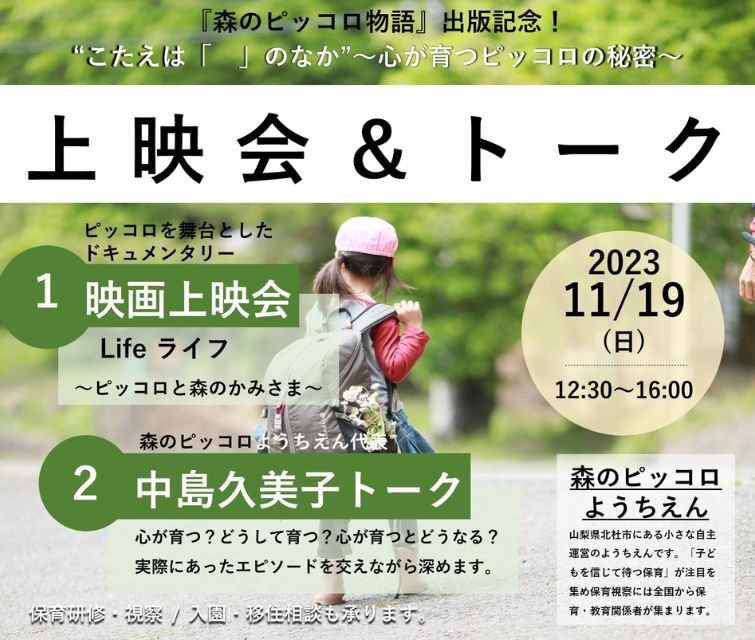 出版を記念し、在園保護者有志でピッコロを舞台としたドキュメンタリー映画『Life ライフ〜ピッコロと森のかみさま〜』の上映と代表・中島久美子によるトークイベントを企画しました。