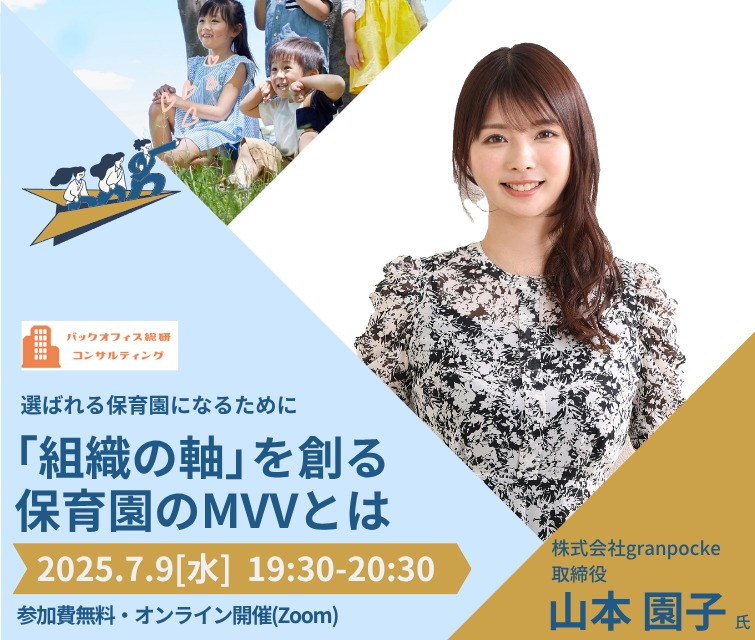 本セミナーでは、保育園・幼稚園・教育関係の経営者・職員向けに、「園内ブランディング®︎」で保育園運営の課題に向き合い、組織づくり・伝える力で職員の意識改革を実行している、株式会社granpocke 取締役・山本 園子氏をお招きし、保育園のチームビルディングに必要なMVVについてうかがいます。