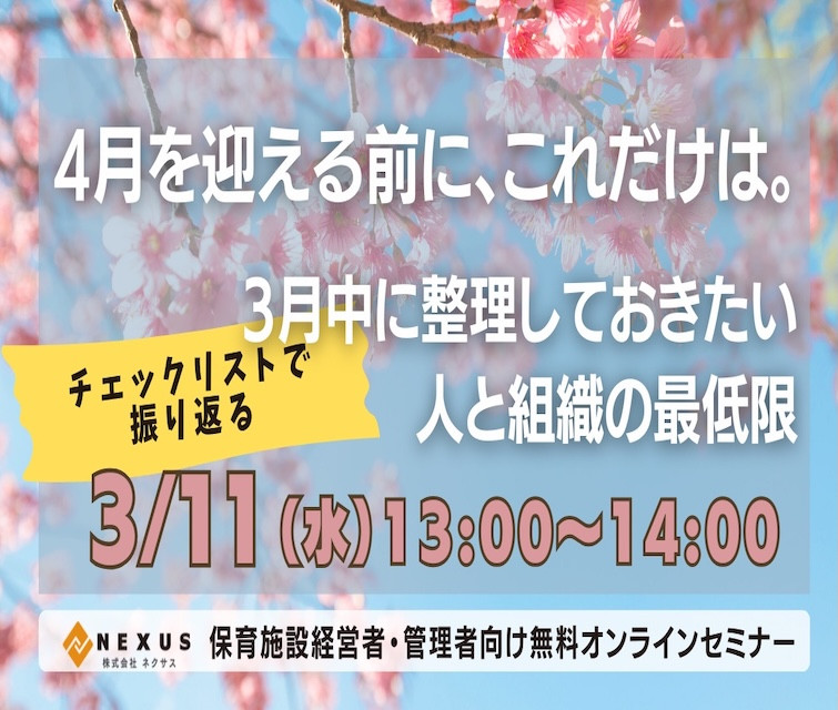 【保育施設経営者・管理者向け無料セミナー】4月を迎える前に、これだけは。〜3月中に整理しておきたい人と組織の最低限〜