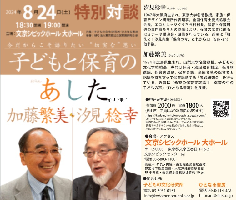 長年、保育者を励まし続けてきてくれたお二人が、今どうしても語っておきたいこと。率直な対話がどんな化学反応をひきおこすか?ぜひ、お立ち合いください。