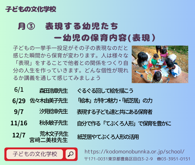 - 詳細は、【月③】表現する幼児たちー幼児の保育内容(表現)ー【対面講座】をご覧ください。