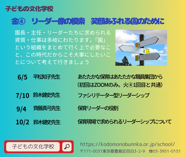 - 詳細は、【金④】リーダー像の模索 笑顔あふれる園のために【ライブ配信併用】をご覧ください。