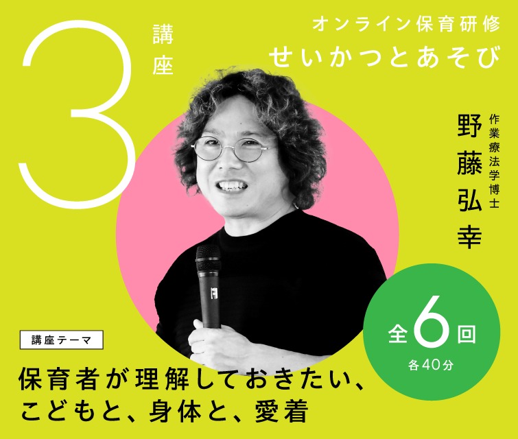 本講座では、感覚・運動・生活・遊び・愛着・非認知能力、これらをキーワードに、保育の具体的な場面を想定して、それに応える手立てを学びます。