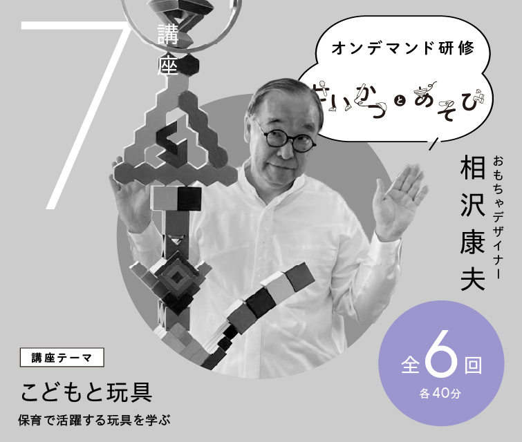 日本でもトップクラスのおもちゃデザイナーである相沢氏を講師にお招きし、保育現場でこどもたちに選ばれてきた玩具をたっぷり紹介していただきながら、玩具の魅力を学びます。