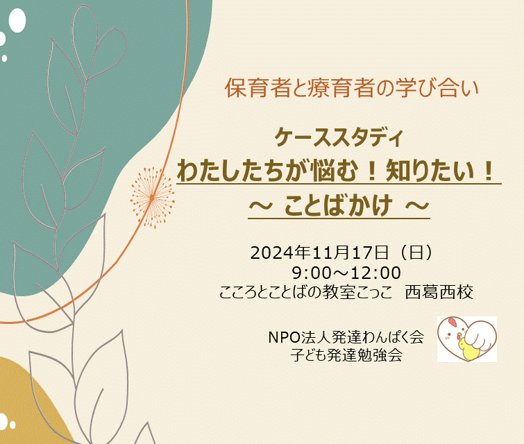 NPO法人発達わんぱく会は、児童発達支援事業所「こころとことばの教室こっこ」を浦安市と江戸川区に設け、 就学前までのお子さんを対象に、療育を通して発達障害、または発達が気になるお子さんの支援をしています。 勉強会に参加するのは、NPO法人発達わんぱく会に所属する療育者です。