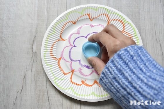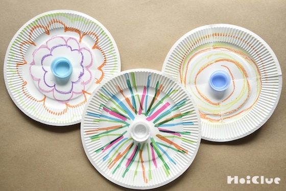 - 紙皿に絵や模様を描くときには、何色か使うとコマが回ったときの絵の変化もおもしろい。折り紙などを貼っても◎