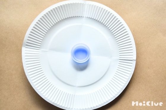 2、十字に折った紙皿を開き、線が交わる真ん中に、ペットボトルキャップ(平らな面)をテープで貼る。