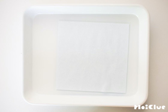 3. バットに水をいれ、その中に「2.」の紙をつけます。