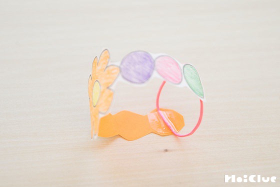 7. ブレスレットを丸め、もう一方の裏側の端に、6と同様に輪ゴムをテープで留めます。