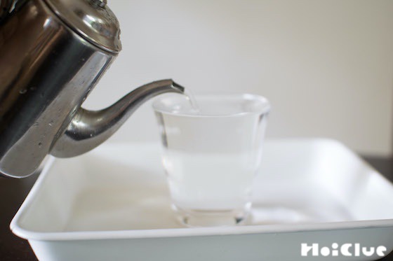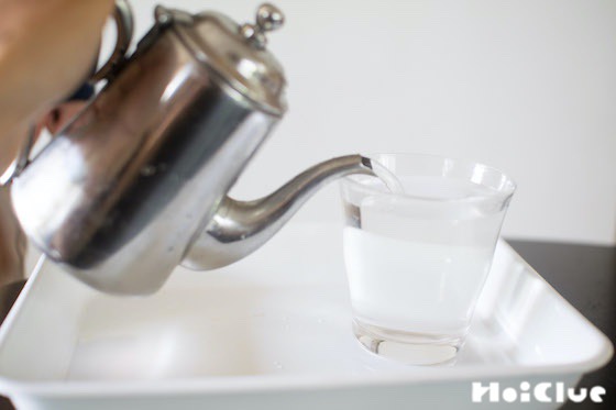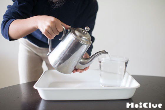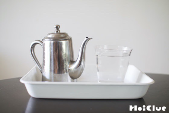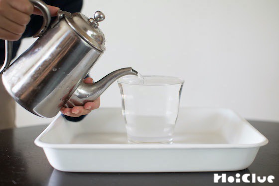 1. 水を入れたコップと、水を入れたミニポット等を用意します。