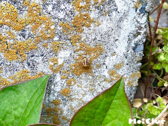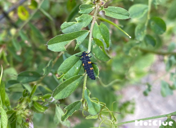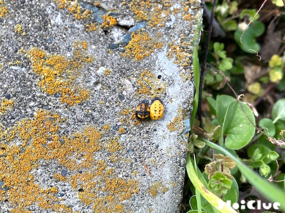 てんとう虫の幼虫とサナギ、成虫とは全然違う形をしていますが、近くに潜んでいることが多いです。