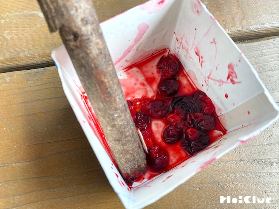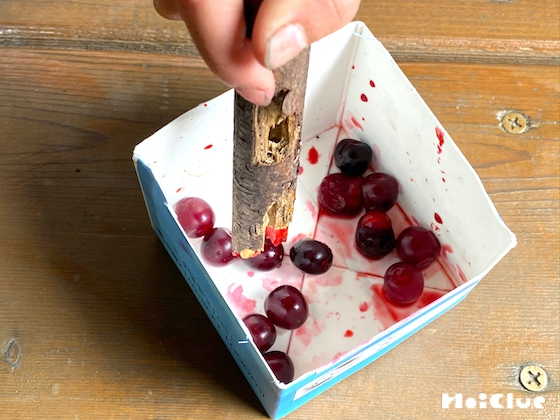 4. 木の枝などで、実をつぶしましょう。