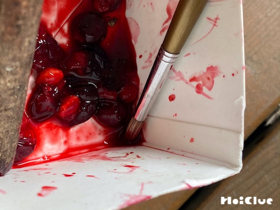 さて、この実をとった子たちは手が真っ赤になっているので、すぐわかるのですが、それを見て「この実の汁で、絵が描けるのではないかな?」と思いつきました。