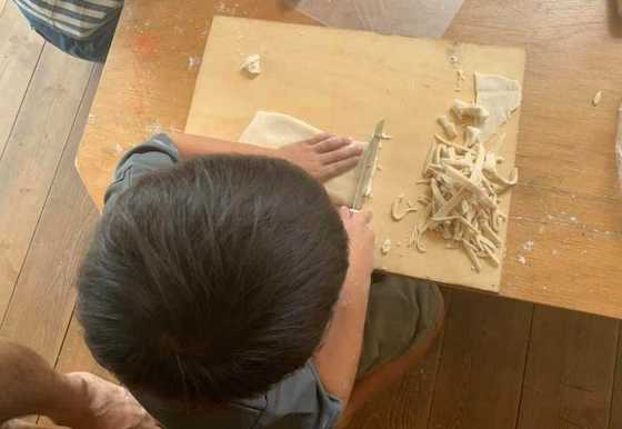 この日のうどんは、園児たちが粉からこねて、包丁で細〜く切った手作りうどん。