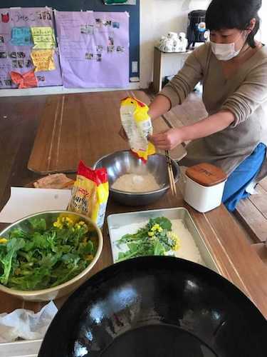 ・園庭で育った菜の花の天ぷら、山で摘んできたミツバとヨモギの天ぷら