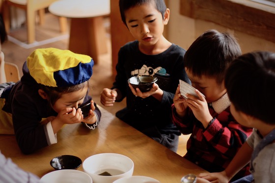 昆布、鰹節、煮干し、干し椎茸。どの出汁のどの組み合わせが美味しいか、みんなで飲み比べていました。