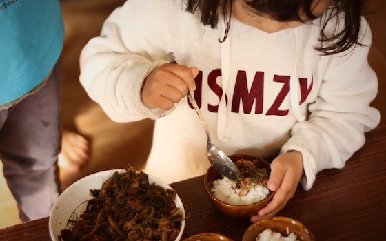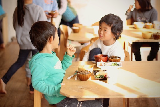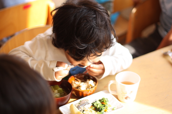 たっぷり遊び、笑い、泣き、戸惑い、時にぶつかりあって、また遊ぶ。そんな子どもたちが一日のなかで一度立ちどまる、「お昼ごはん」の時間。