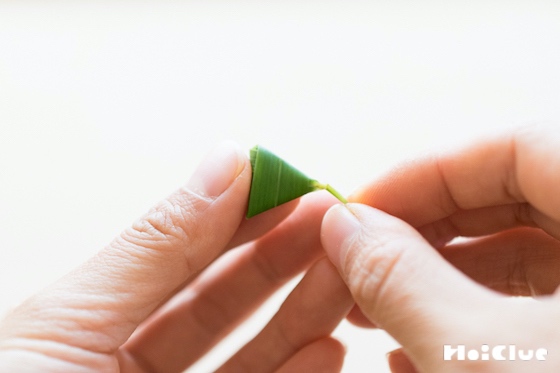 2. 葉の先を、どちらかの辺にくっつけるように、折り曲げます。