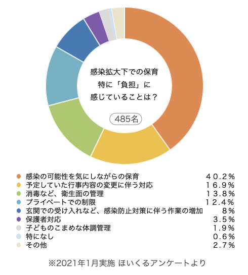 次に多かった「この状況がいつまで続くのか」という回答からは、一年近く続くコロナ禍での保育に、疲弊している様子が伝わってきました。