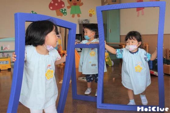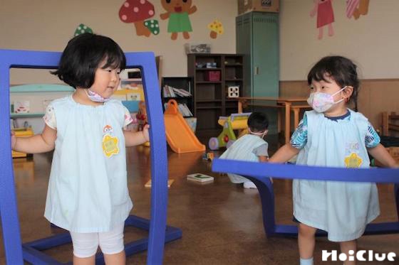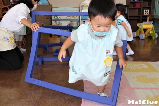 他にも、中くらいの枠を立てて「いらっしゃいませ~」としたり、枠内に入り手を広げて「ひこうき!」と走りまわったり。