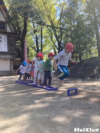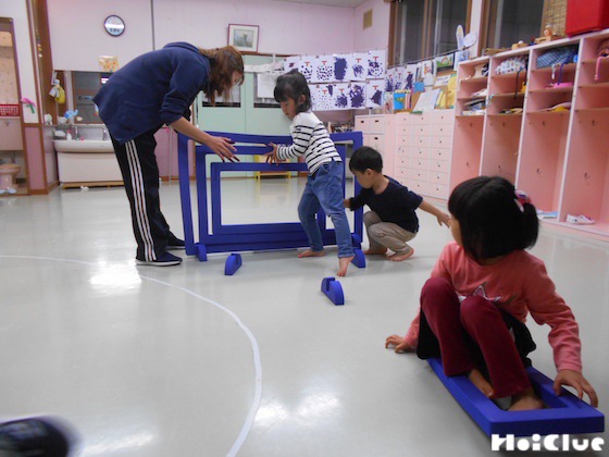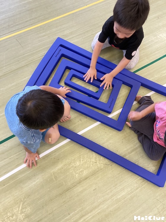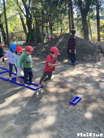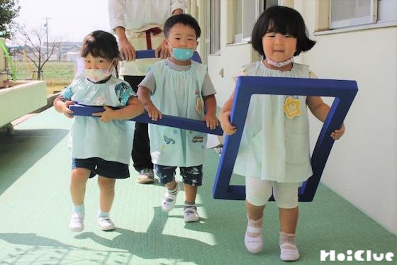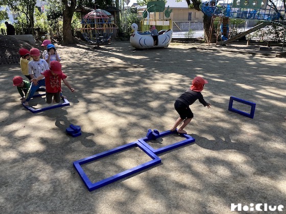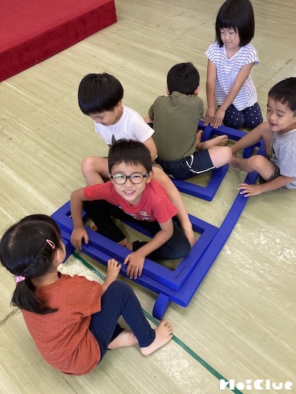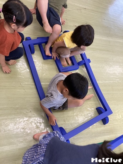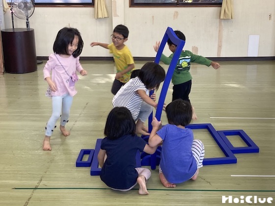 ごっこ遊びの中に取り入れたり、四角の中をくぐったり、ジャンプをしたり、友だちとお話をし、協力しながら様々なものに見立てて遊ぶ姿が見られました。(幼稚園・3歳児)