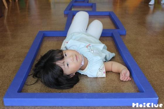 “わくわく”の上を線上歩行(モンテッソーリ教育にある、線のうえを足を丁寧に運んで歩く活動)