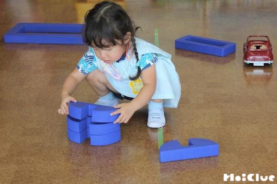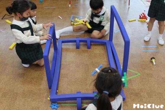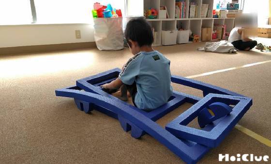 こちらは、一人の子が枠を組み立てて車を作って遊んでいると、他の子も「わたしも乗せて」と一緒に遊びを展開。
