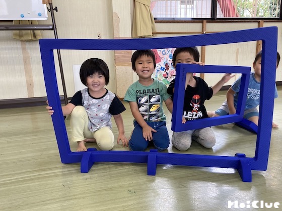 横向きに立てて「写真しよう」枠内に並んでポーズをとり、それを、他の子が小さい枠をカメラに見立てて「カシャ」と撮る。